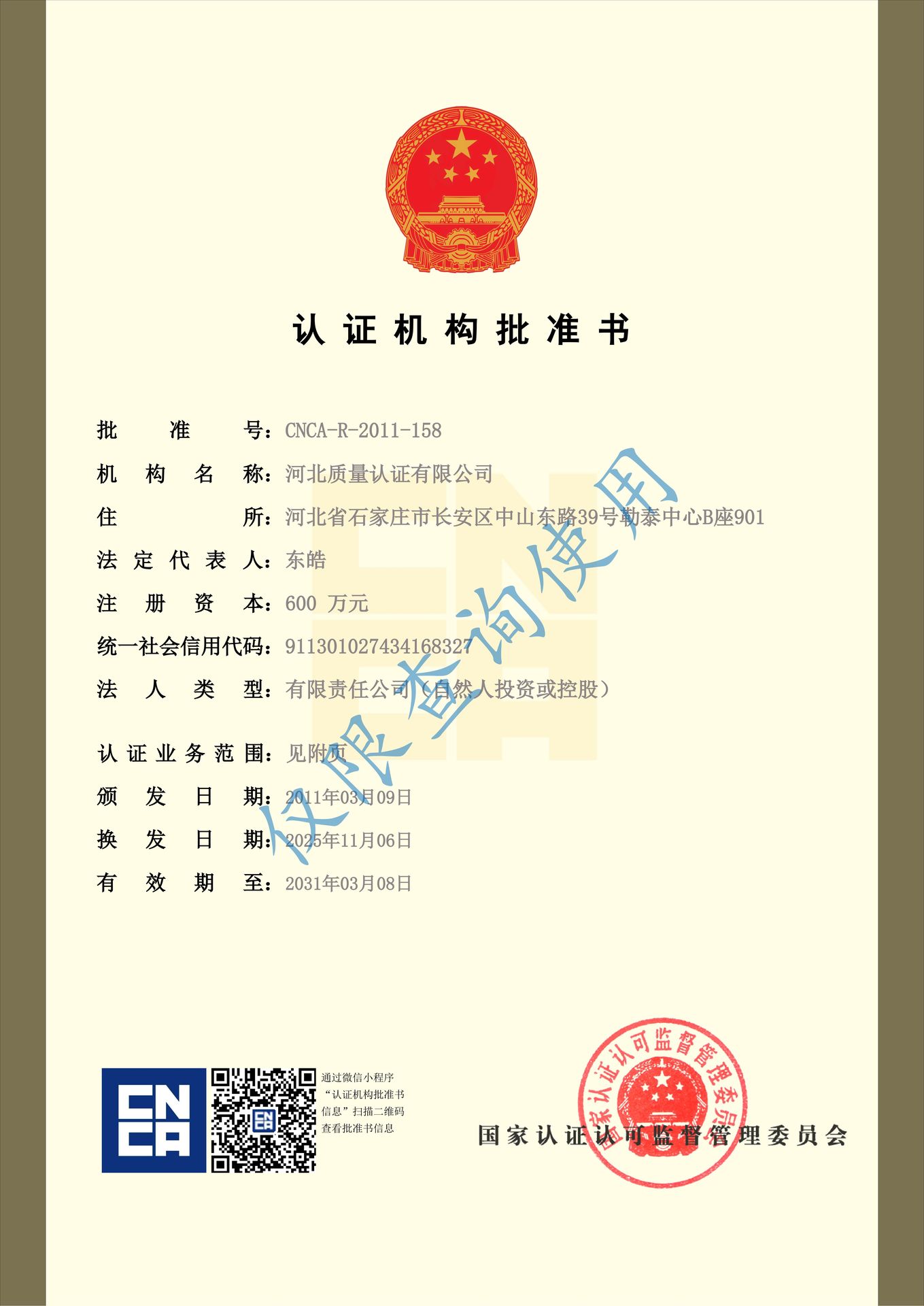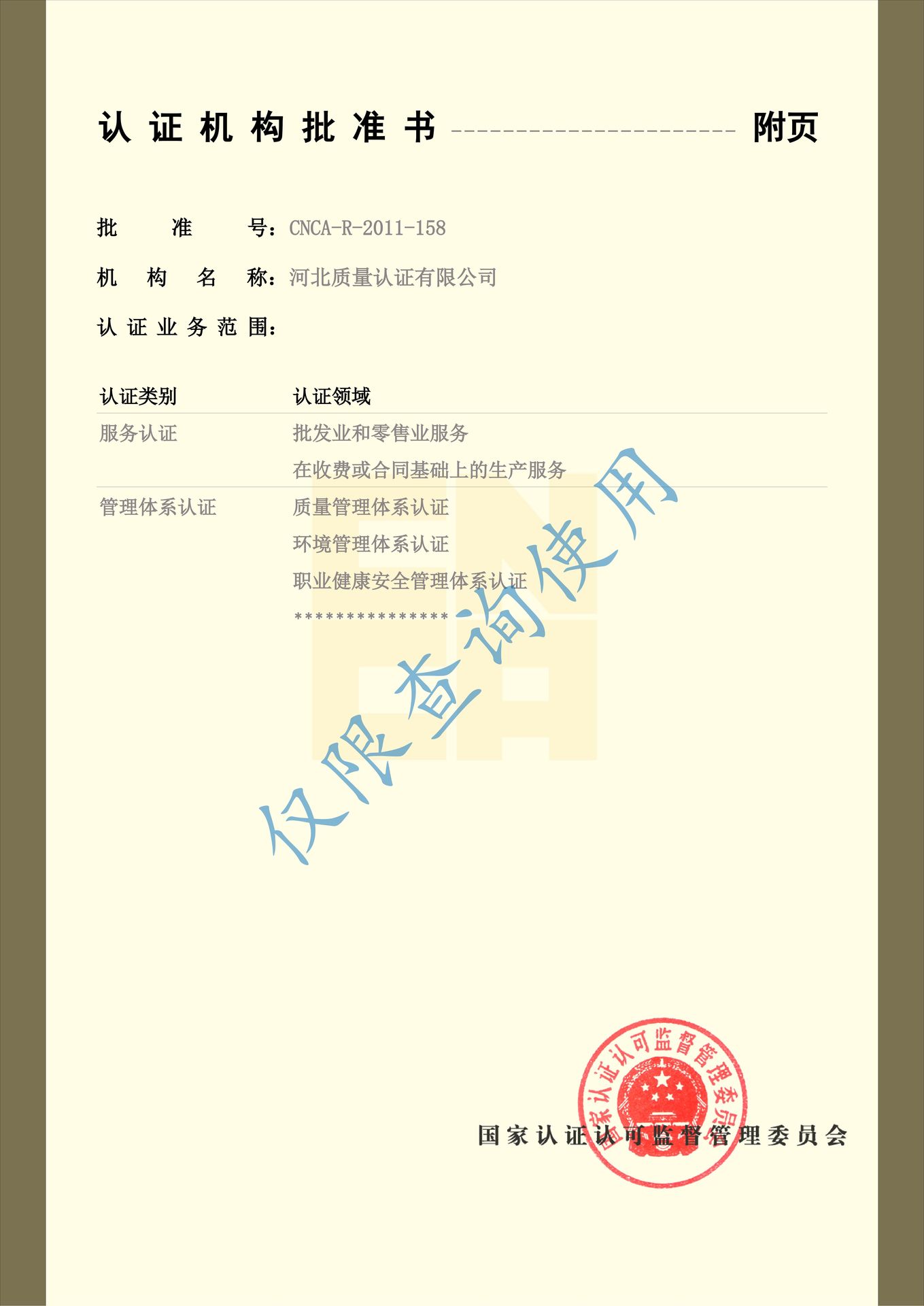 河北质量认证有限公司(HBAC) ,创立于1995年,1998年由国家认可委员会认可,国家质量技术监督局批准的第三方认证审核机构。2002年由中国国家认证认可监督管理委员会重新登记,2011年3月9日批准为独立认证机构(批准号:CNCA-R-2011-158),并经中国合格评定国家认可中心认可(CNAS-C145),成为国际认可论坛多边协议(IAF/MLA)认可的认证机构。从事质量管理体系(ISO9001)、环境管理体系(ISO14001)、职业健康安全管理体系(ISO45001)、工程建设施工行业质量管理体系(GB/T50430)、商品售后服务认证、批发零售业服务认证、HSE管理体 系、 医疗器械质量管理体系、 合规管理体系、社会责任管理体系 及相关培训活动。